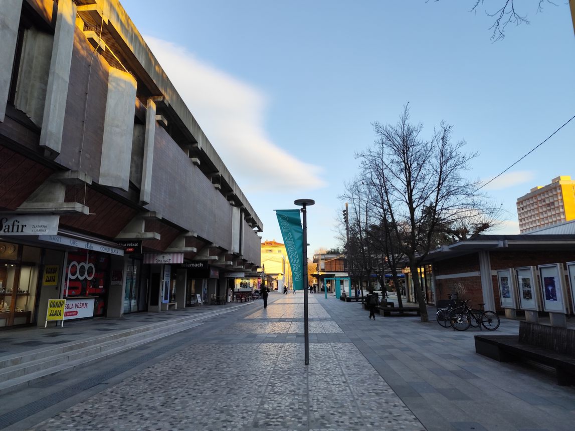 Na drugi strani sprehajališča je bila nekoč ulica in parkirišče. Ob njej je bil v začetku sedemdesetih zgrajen salon tovarne pohištva Meblo (Bevkov trg 6), kasneje pa še Kulturni dom Nova Gorica