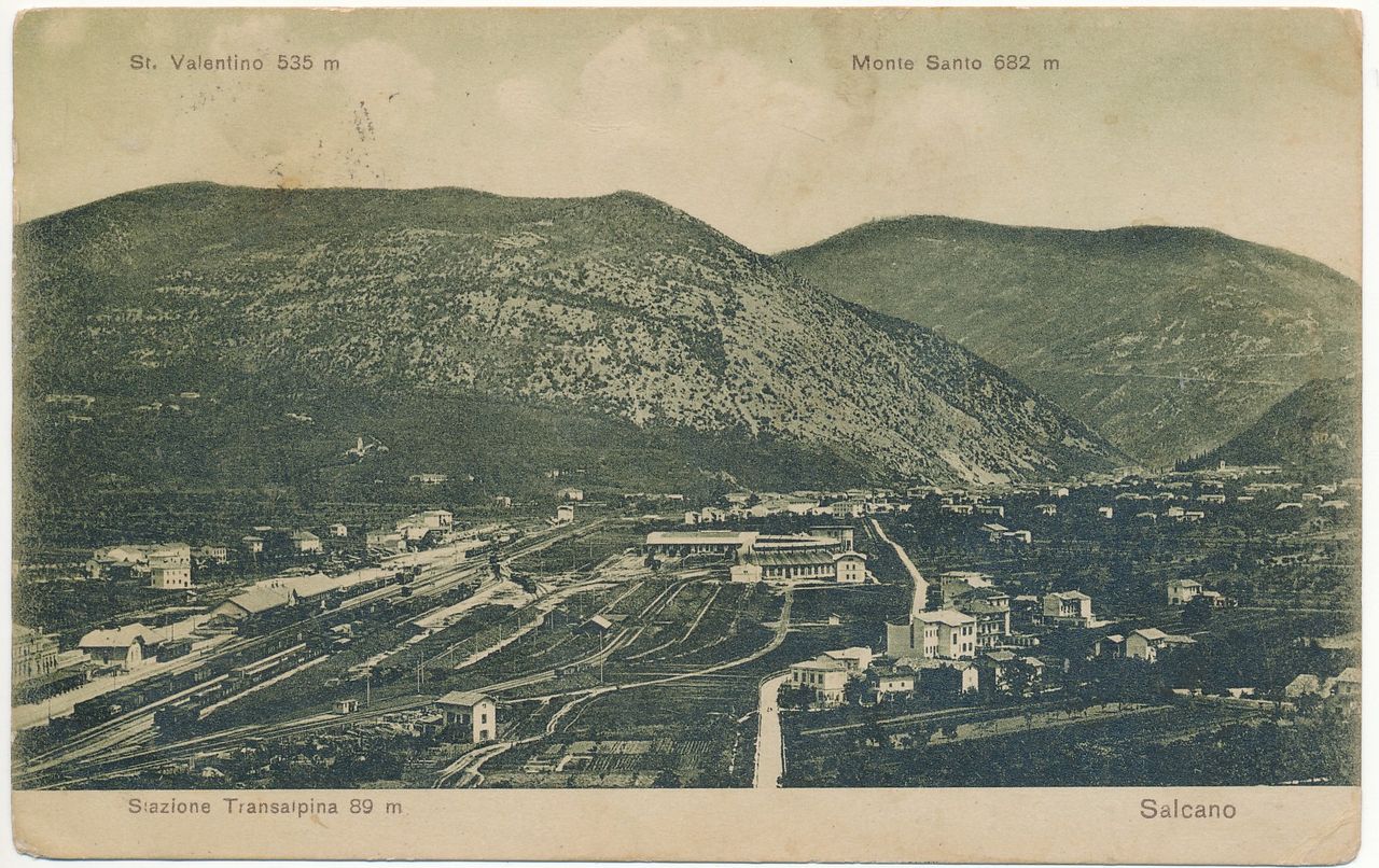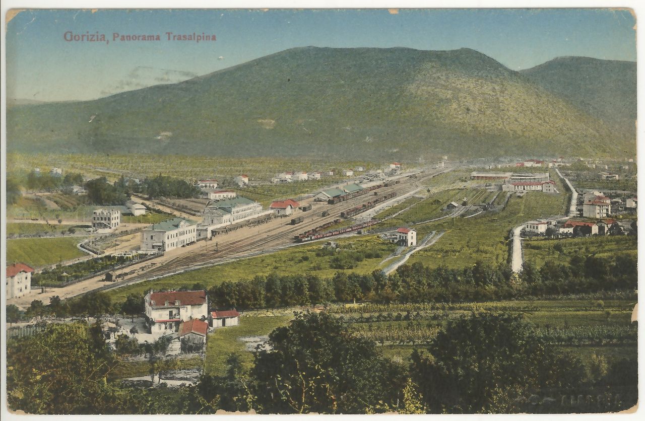 Območje Nove Gorice pred izgradnjo z železniško postajo, v ozadju Sabotin in Sveta gora. Foto hrani Pokrajinski arhiv Nova Gorica..