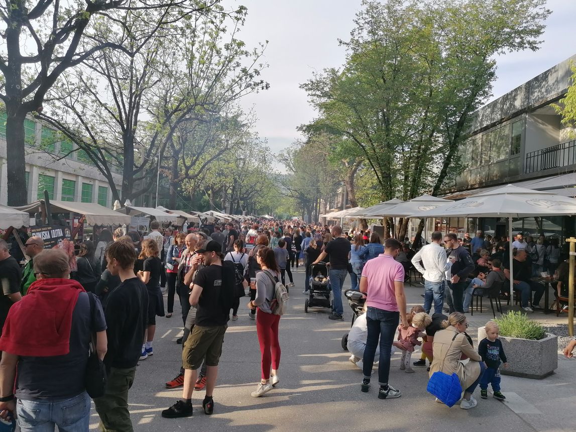 V prid čim večjemu izkoristku prostora so bile trgovine oblikovane tako, da istočasno delovale tudi kot tudi izložbe. V njih je našla prostor prva kavarna in slaščičarna v mestu (kasneje tudi pizzerija), pekarna Pecivo, mesnica, supermarket, sadje in zelenjava, frizer, vmes pa tudi mestna tržnica.