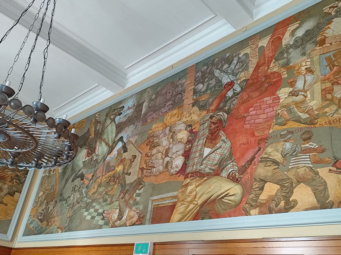 Ob tem pa velja omeniti tudi mozaike, ki se nahajajo v vhodni avli pred atrijem. Alegorične motive je narisal Tone Žnidaršič (1923–2007), mozaike pa je izdelal Alfio Tambosso - Ultra (1914–1992), diplomant ene najznamenitejših šol za mozaike v Spilimbergu pri Vidmu, ki je iz Italije prebegnil v Jugoslavijo. Ultra je svoje znanje kasneje uporabil tudi pri izdelavi velikega mozaika v zgradbi Zveznega izvršnega sveta v Beogradu.