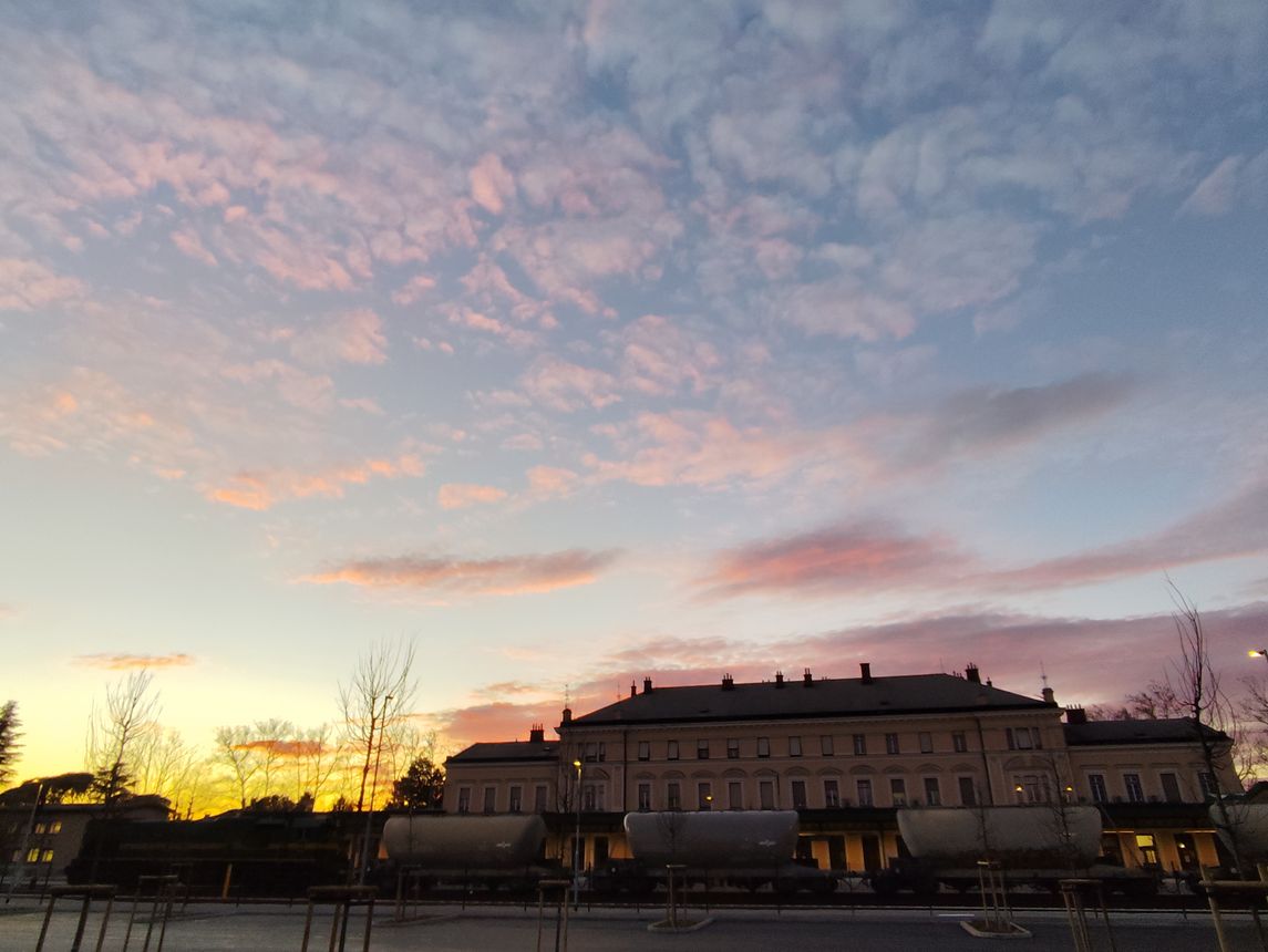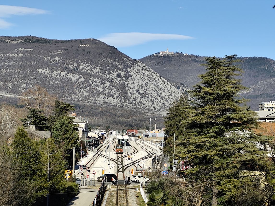 Železniški tiri s postajo, v ozadju Sabotin in Sveta gora. Foto: Blaž Kosovel.