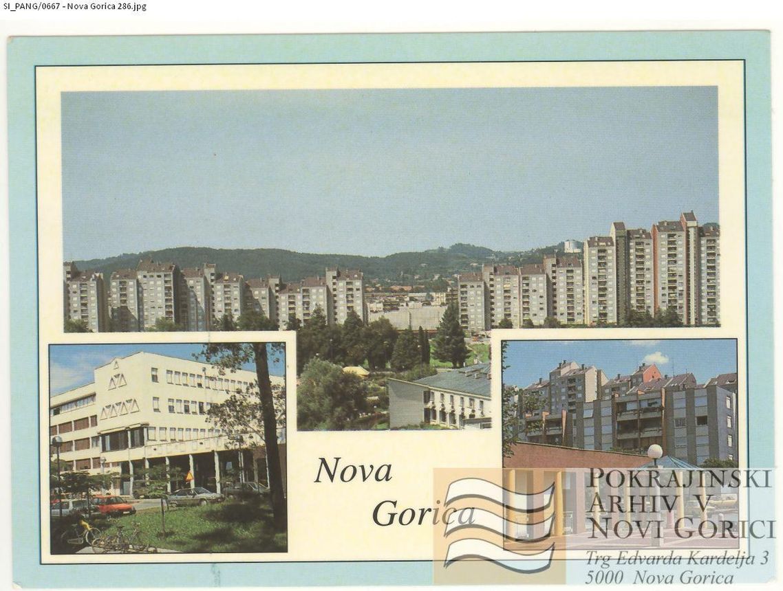 Razglednica ulice Gradnikove brigade, odposlana leta 1994. ©hrani Pokrajinski arhiv v Novi Gorici - PANG 667 Zbirke razglednic krajev Nova Gorica, št. 286