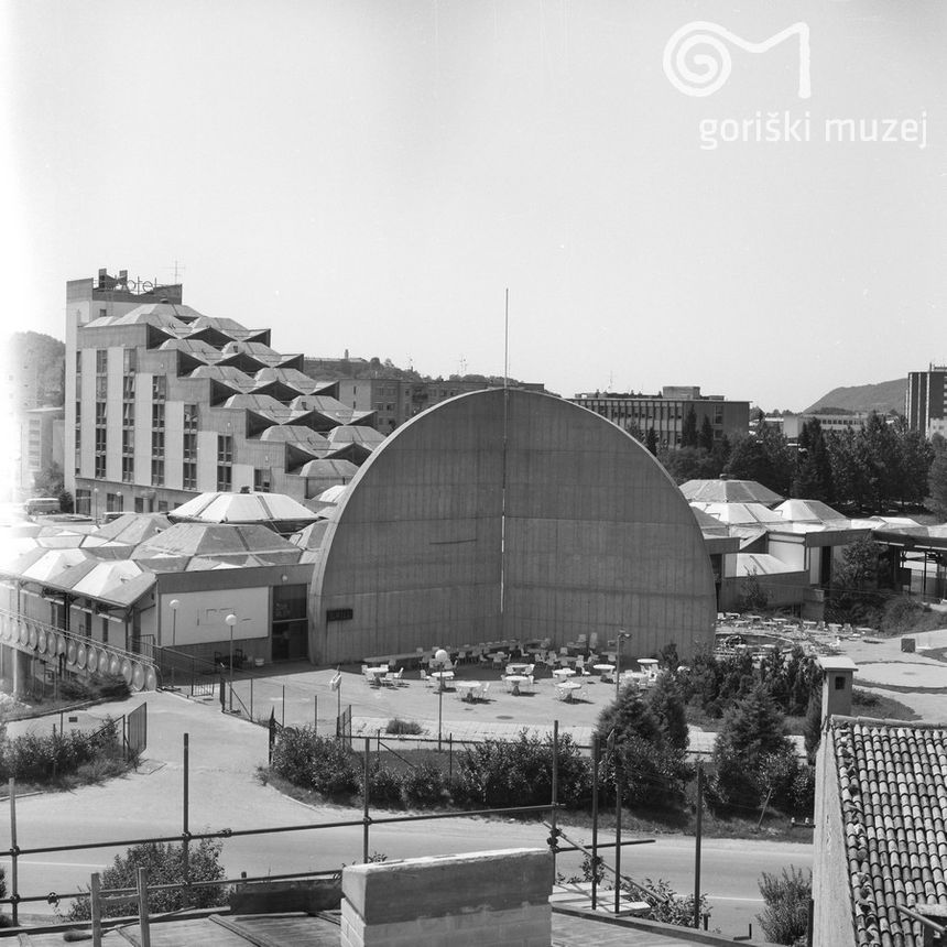 Hotelsko-rekreacijski in zabaviščni center Argonavti s 15-metrsko sončno uro v ospredju (porušeno leta 1999), konec 70. let. ©Foto Pavšič, hrani Goriški muzej Kromberk - Nova Gorica