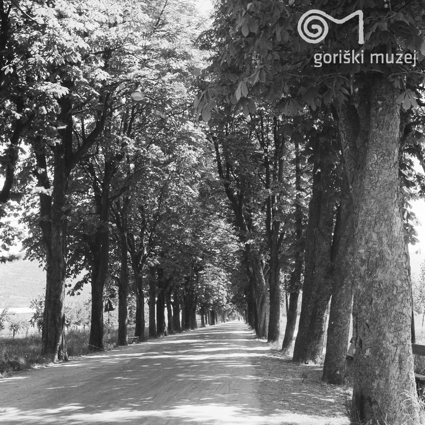 Nekdanji drevored na današnji Erjavčevi ulici leta 1959. Cesta je prvotno vodila do nekdanjega gorškega pokopališča. ©Foto Pavšič, hrani Goriški muzej Kromberk - Nova Gorica