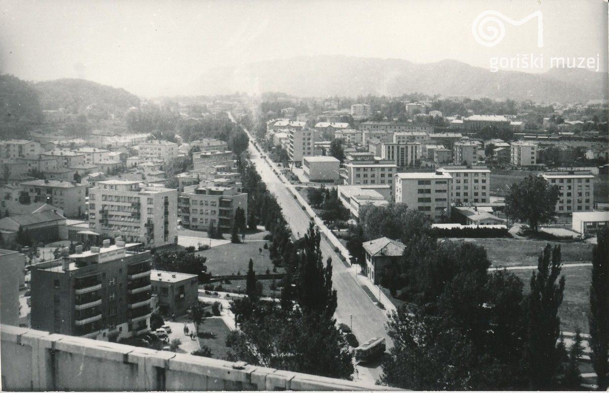 Pogled na Erjavčevo ulico iz nebotičnika. ©Fotografijo hrani Goriški muzej Krobmerk - Nova Gorica.