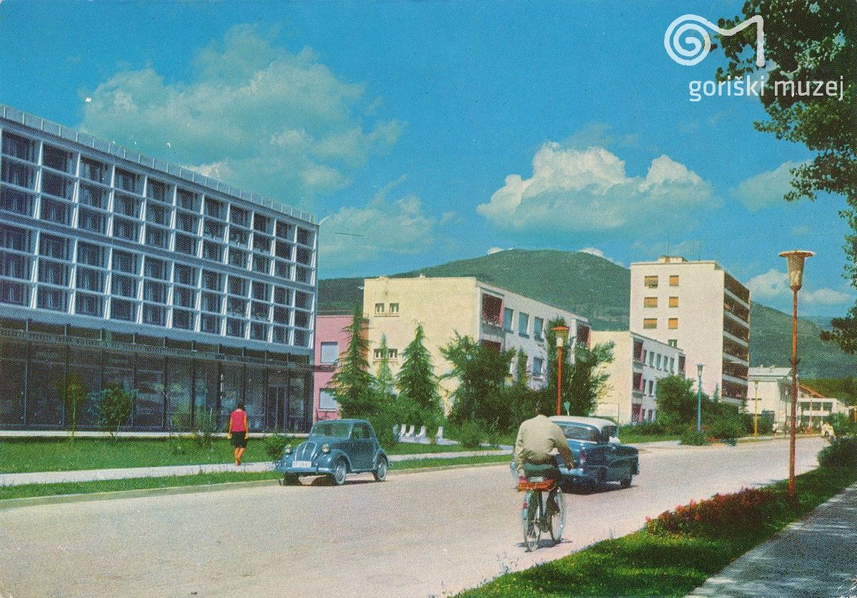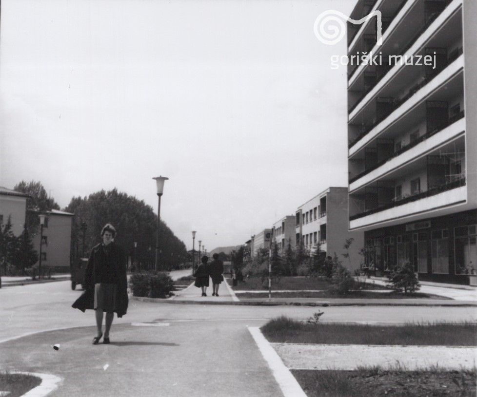 Erjavčeva ulica ob koncu 60. letih. Od leve proti desni: sedež Elektro Primorska, sedež Soških elektrarn, prvi »nebotičnik«, v katerem je bila prva (in še vedno delujoča) samopostrežna trgovina v mestu. V ozadju na sredini hrib Škabrijel ©Fotografijo hrani Goriški muzej Krobmerk - Nova Gorica.