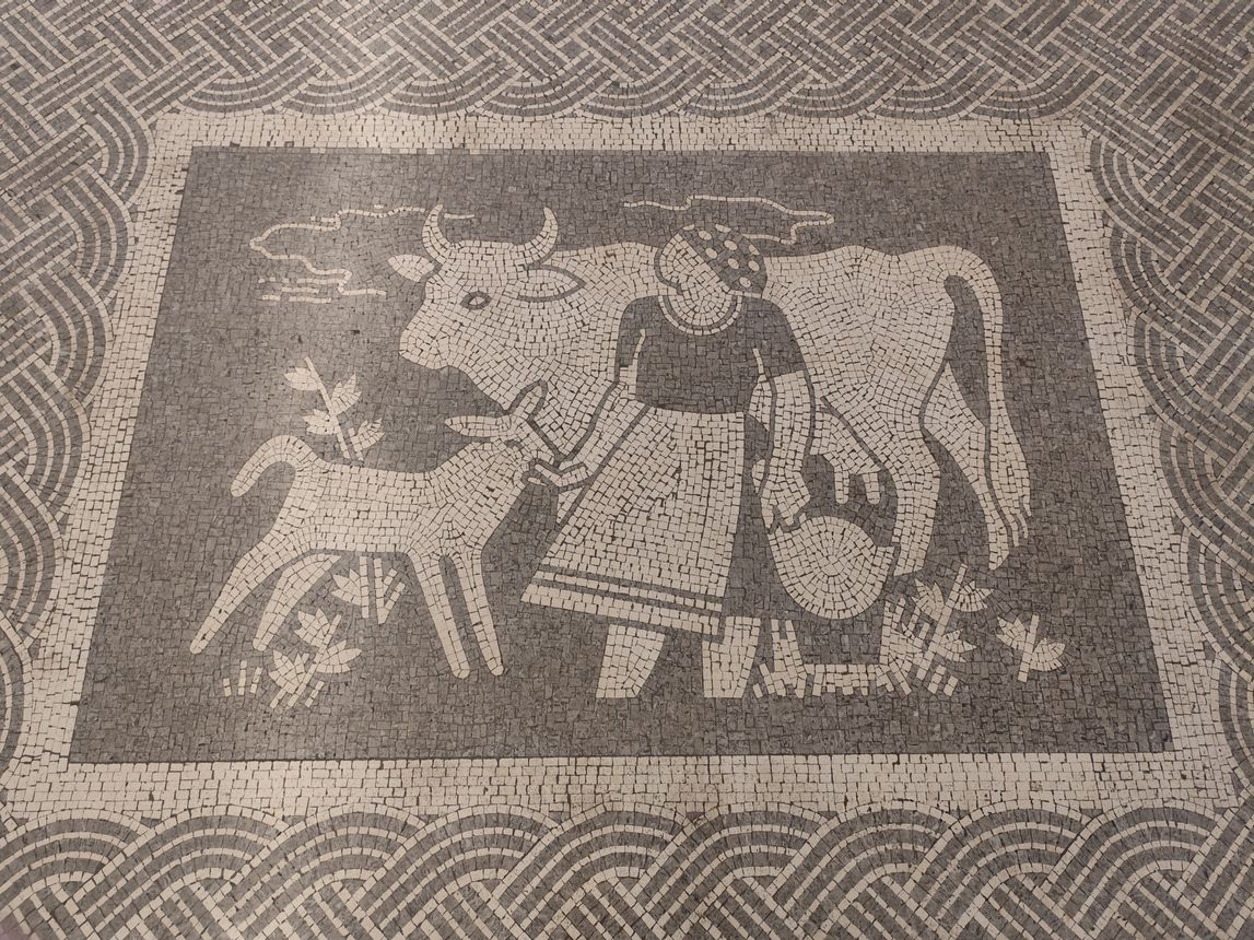Alegorične motive je narisal Tone Žnidaršič (1923–2007), mozaike pa je izdelal Alfio Tambosso - Ultra. Atrij občine. Foto: Blaž Kosovel.