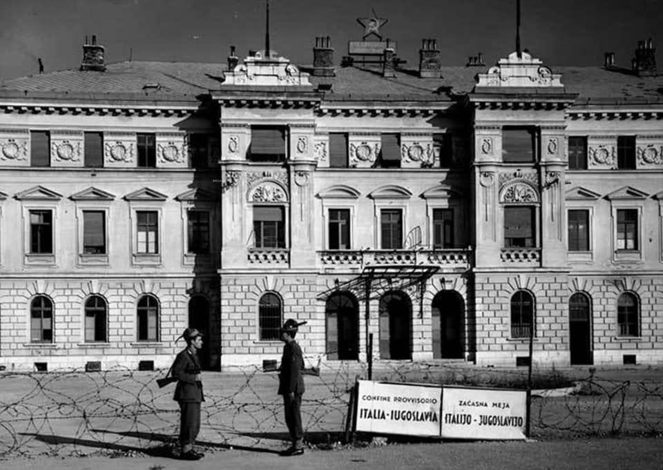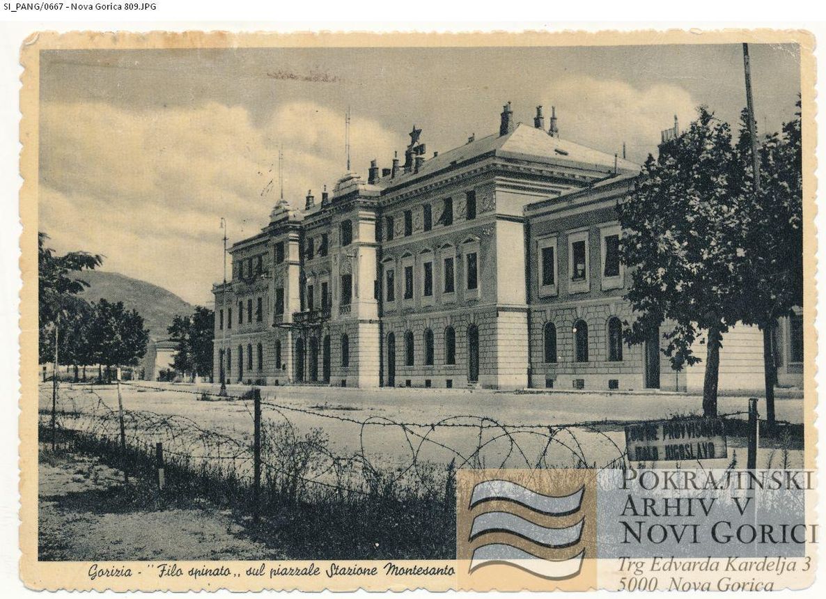 Železniška postaja kmalu po razmejitvi leta 1947, bodeča žica teče po novi meji med Italijo in Jugoslavijo. ©Postcard from the collection of Regional Archive in Nova Gorica (Pokrajinski arhiv v Novi Gorici). PANG 0667 Nova Gorica: železniška postaja, meja [razglednica]
